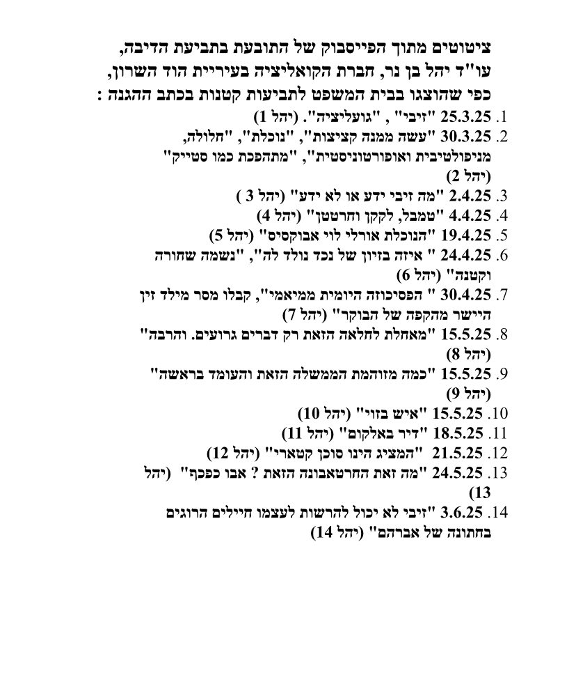 ציטוטים מתוך הפייסבוק של התובעת בתביעת הדיבה, עו"ד יהל בן נר, חברת הקואליציה בעיריית הוד השרון, כפי שהוצגו בבית המשפט לתביעות קטנות בכתב ההגנה: